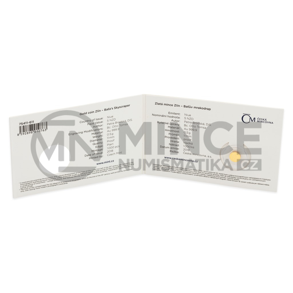 Samotná mince, která je dílem nadané medailérky Petry Brodské, DiS., je věnována Baťovu mrakodrapu, který vznikl v letech 1936 až 1938 jako moderní ředitelství světoznámé obuvnické firmy. Se 17 patry a výškou 77,5 m se jednalo o druhou nejvyšší budovu Evropy. Funkcionalistickou stavbu na reverzní straně doplňuje opis ZLÍN. Averzní strana pak patří náležitostem ostrova Niue, emitenta, který České mincovně poskytuje zahraniční licenci k ražbě vlastních pamětních mincí. Jsou jimi jméno a portrét královny Alžběty II., rok vydání 2018 a nominální hodnota 5 DOLLARS (NZD).