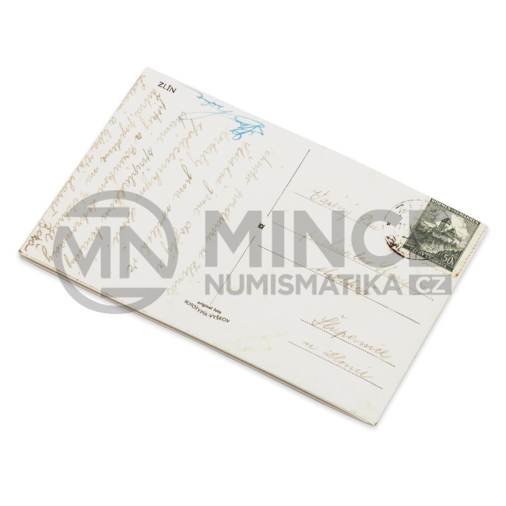 V sérii dobových pohlednic se dosud objevovaly výhradně tzv. litografické pohlednice z konce 19. století. Ty vyžadovaly náročnou uměleckou přípravu a jejich výroba byla finančně nákladná. Dovolit si je proto mohla jen některá města. Ve 20. století sáhl Zlín po moderních fotopohlednicích. Originální pohlednice, která České mincovně posloužila jako předloha balení mince, pochází ze sbírky pana Pavla Vursty. Tiskovina dokumentující hospodářský a kulturní rozvoj Zlína v první polovině 20. století byla vydána bromografickým nakladatelstvím Fototypia Vyškov (František Kusák) v roce 1935 a odeslána v roce 1940 za nacistické okupace. Patří do sběratelsky cenné skupiny tzv. pohlednicových montáží – zachycuje centrum města, významné industriální stavby, medailonky průmyslníků i typické letadlo. Kompozici pohlednice dotváří automobilová pneumatika a nápisy ZLÍN – MĚSTO DOBRÝCH BOT a LIDEM MYŠLENÍ – STROJŮM DŘINU.