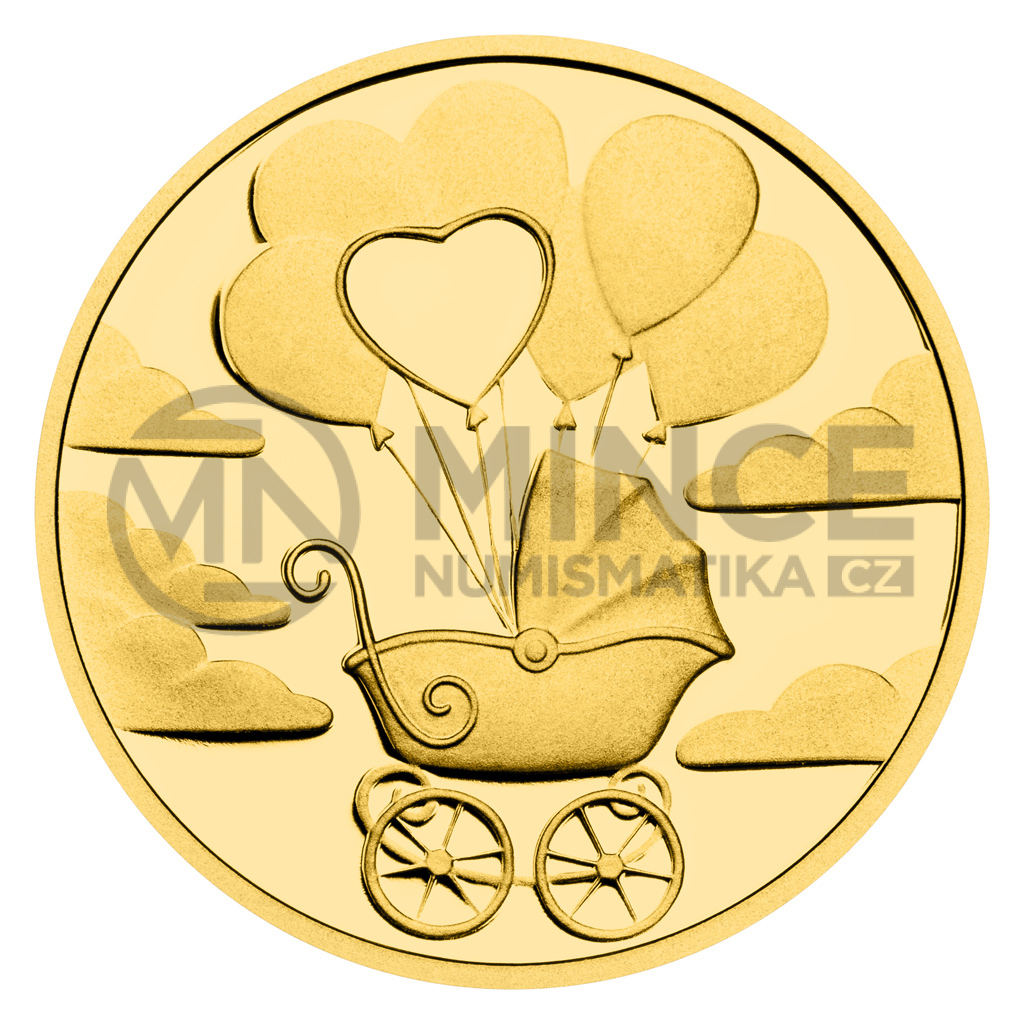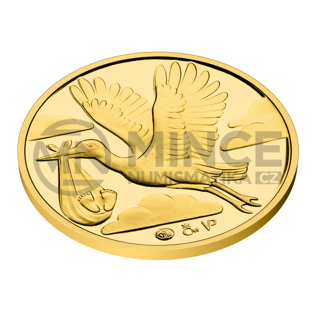 Čápovi, který v zobáku nese uzlíček, věnovala medailérka Veronika Prokopová, DiS., reverzní stranu zlatého dukátu. Averzní strana pak předkládá letící kočárek, který nadnášejí balonky.